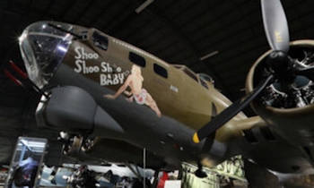 Shoo Shoo Shoo Baby, a B-17G, crash landed in Malmo, Sweden, on May 29, 1944, after a bombing mission to Poland (originating in England). The bomber, pictured here when it was still on display at the National Museum of the US Air Force in Dayton, Ohio, is currently in storage awaiting a move to the National Air and Space Museum. The plane was named after a popular Andrews Sisters' song, which will play while you view this panorama.