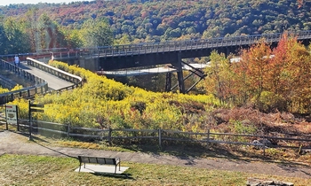 The Kinzua Viaduct was one of the longest and highest railroad bridges anywhere (301 ft. above the valley, 2053 ft. long) until 2003 when it was partially destroyed by a tornado. The acreage surrounding the bridge was purchased in 1963 by the State of Pennsylvania after a failed attempt to reclaim the bridge as scrap. In 2011, the remaining bridge structure (600 ft.) was restored as a pedestrian walkway and observation platform. In 2016, a superb visitor center/museum was built to display artifacts of historical interest. This tour is will feature two panoramas, a spherical, followed by a high-resolution flat panorama.