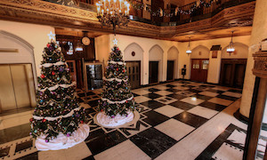 The main lobby of the spectacular Masonic Temple during the Christmas Season. One spherical panorama taken from 8 feet. Panorama will auto rotate (click anywhere in panorama to play Ave Maria in the background--manual controls will also function during rotation).