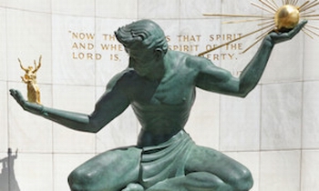 There are 3 interesting monuments at the foot of Woodward Avenue: the Fist is a replica of Detroiter, Joe Louis' right hand (1986, 24-feet long, by Robert Graham), the Michigan Labor Monument is across Jefferson in Hart Plaza (2003), and the Spirit of Detroit graces City Hall (1958, 26-feet high, by Marshall Fredericks). The Spirit is affectionately known to Detroiters as "The Green Giant" and has often worn the oversize jerseys of Detroit's professional sports teams. There will be 3 spherical panoramas in this tour, followed by a high resolution flat panorama generated from 16 component pictures shot with a 105mm lens. Try zooming way in.